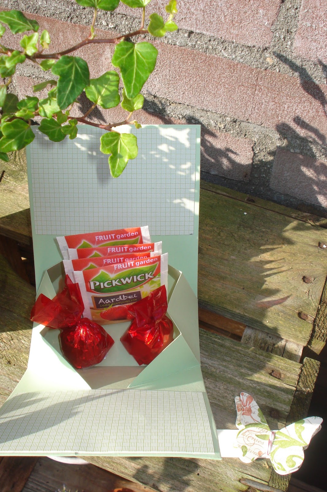 De band met de vlinder dient als een soort van slot en kun je er makkelijk afschuiven en valt het doosje zo open. De binnenkant kun je natuurlijk aankleden zoals je zelf wilt, ik heb het zelf zoals je ziet rustig gehouden. Toch leuk om kado te geven dacht ik zo...Geniet van het weer dames, ik ga dat ook doen en ik zou zeggen Knuf en tot Blogs Peet